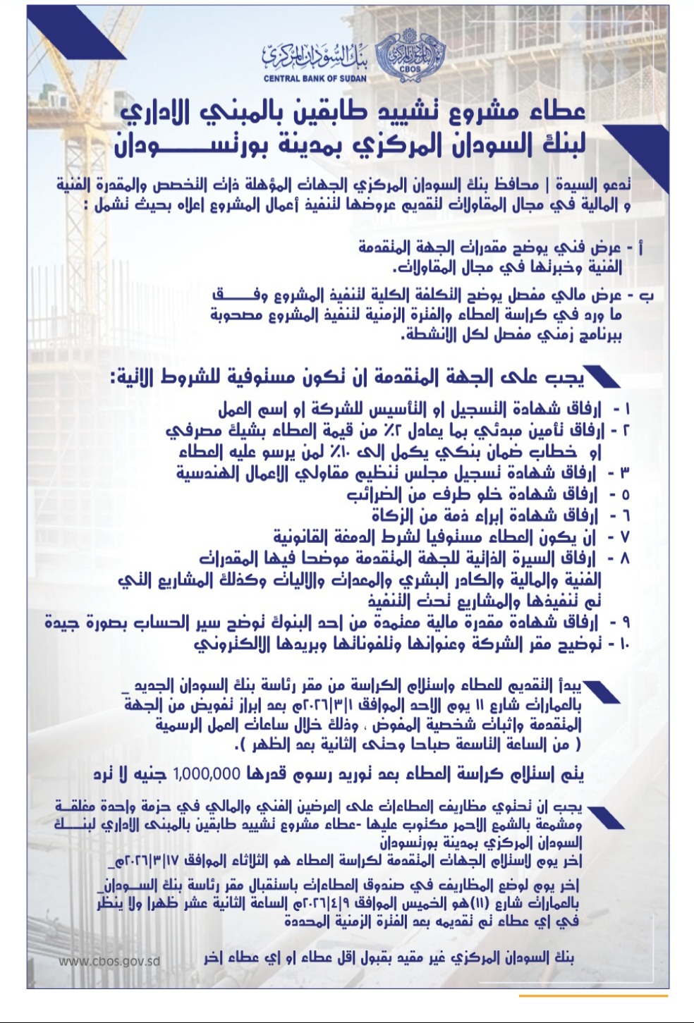 اعلان مهم .... اعلان عطاء مشروع تشييد طابقين للمبنى الإداري لبنك السودان المركزي بمدينة بورتسودان.