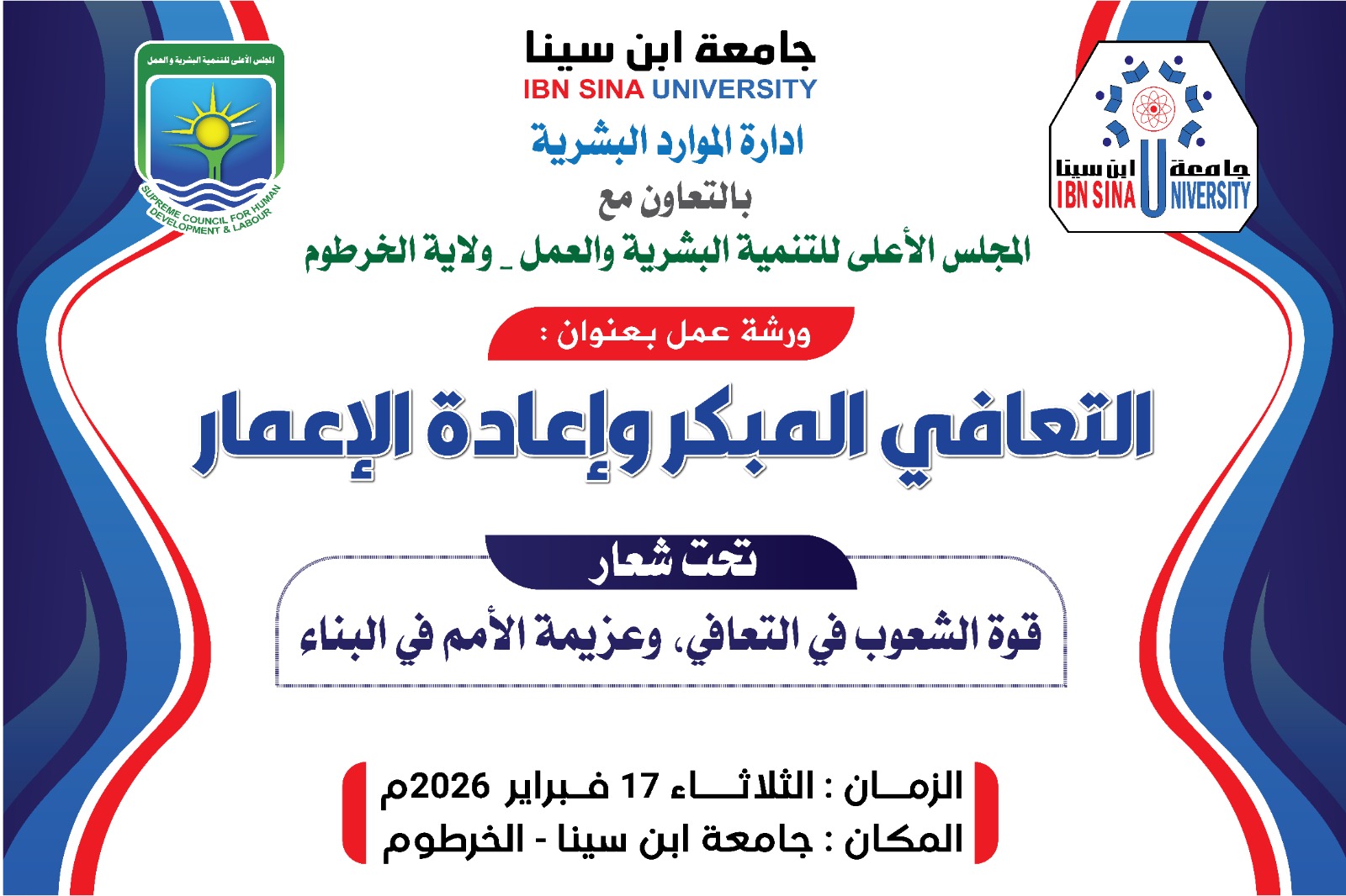 اقامت جامعة ابن سيناء ورشة عمل التعافي الوطني المبكر بمقر الجامعة بالخرطوم جنوب بالتعاون مع المجلس الاعلي للتنمية البشرية والعمل بولاية الخرطوم.تحت شعار قوة الشعوب في التعافي وعزيمة الأمم في البناء و ناقشت الورشة موضوعات التعافي المبكر وأهميته في استعادة بئة عمل مناسبة للعائدين من طلاب وعمال وموظفين