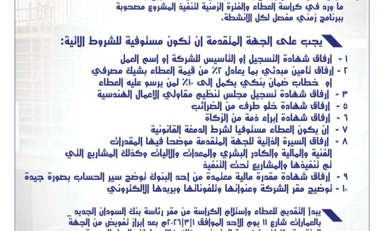 اعلان مهم… اعلان عطاء مشروع تشييد طابقين للمبنى الإداري لبنك السودان المركزي بمدينة بورتسودان.
