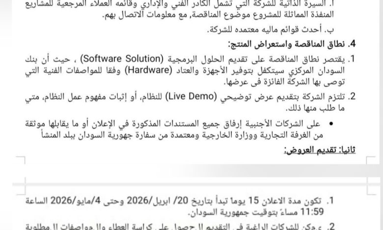 اعلان مهم….بنك السودان المركزي.. .اعلان مناقصة  مشروع تنفيذ نظام المدفوعات الفورية القومي (NIPS)